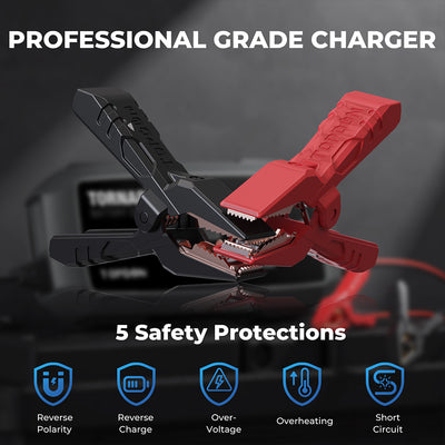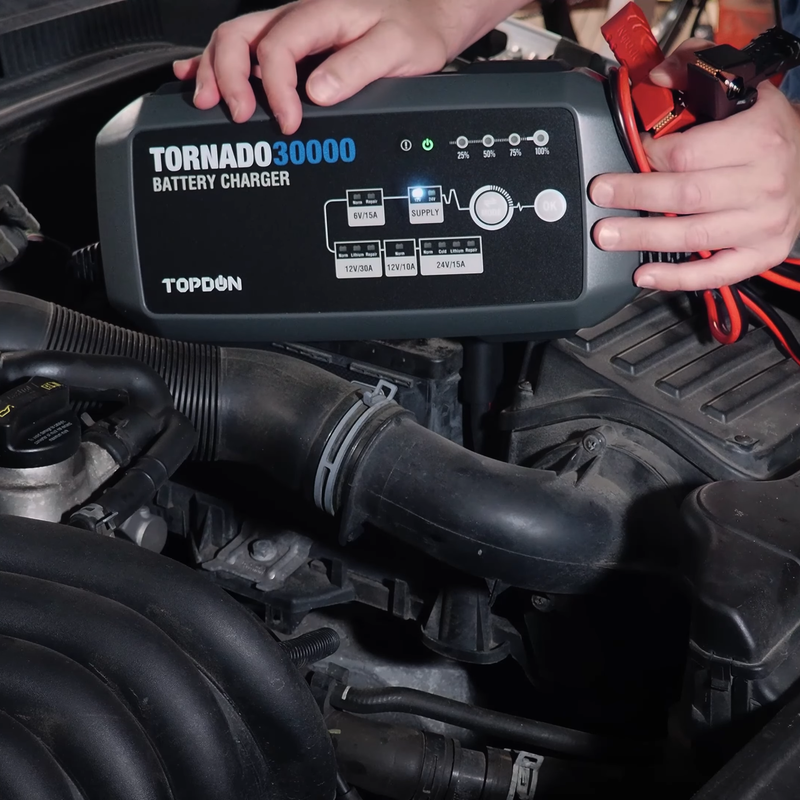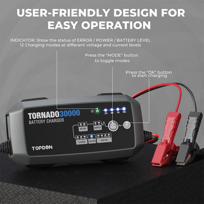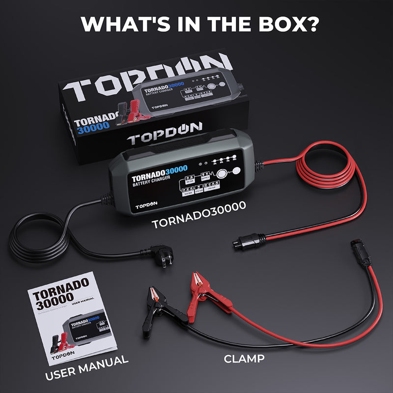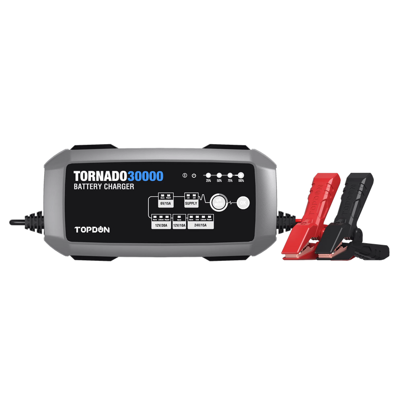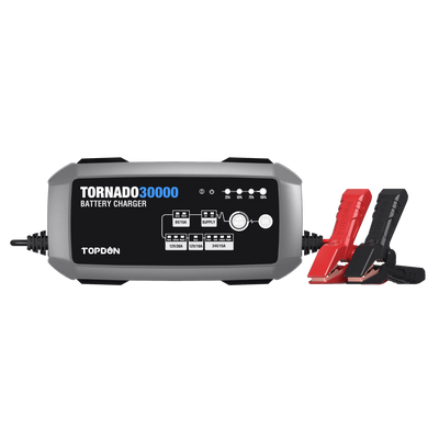 Tornado30000 je chytrá nabíječka střední až vyšší třídy určená pro osobní nebo komerční použití, opravárenské stanice a další. Může oživit 6V, 12V a 24V olověné baterie i 12V/24V lithiové baterie. Toto zařízení podporuje rozsah kapacit baterií od 50Ah do 1000Ah. S 9-krokovou metodou chytrého nabíjení a 12 nabíjecími režimy poskytuje Tornado30000 svým uživatelům bezkonkurenční ochranu a nabíjecí schopnosti.