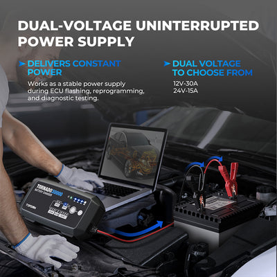 - Tornado30000 také funguje jako stabilní napájecí zdroj pro zařízení 12V a 24V! Můžete udržovat napětí vozidla na 12V, aby nedošlo k vybití během oprav. S Tornado30000 získáte bezpečnou napájecí stanici, která zabraňuje provozním zpožděním, nestabilitě zařízení a poruchám.
