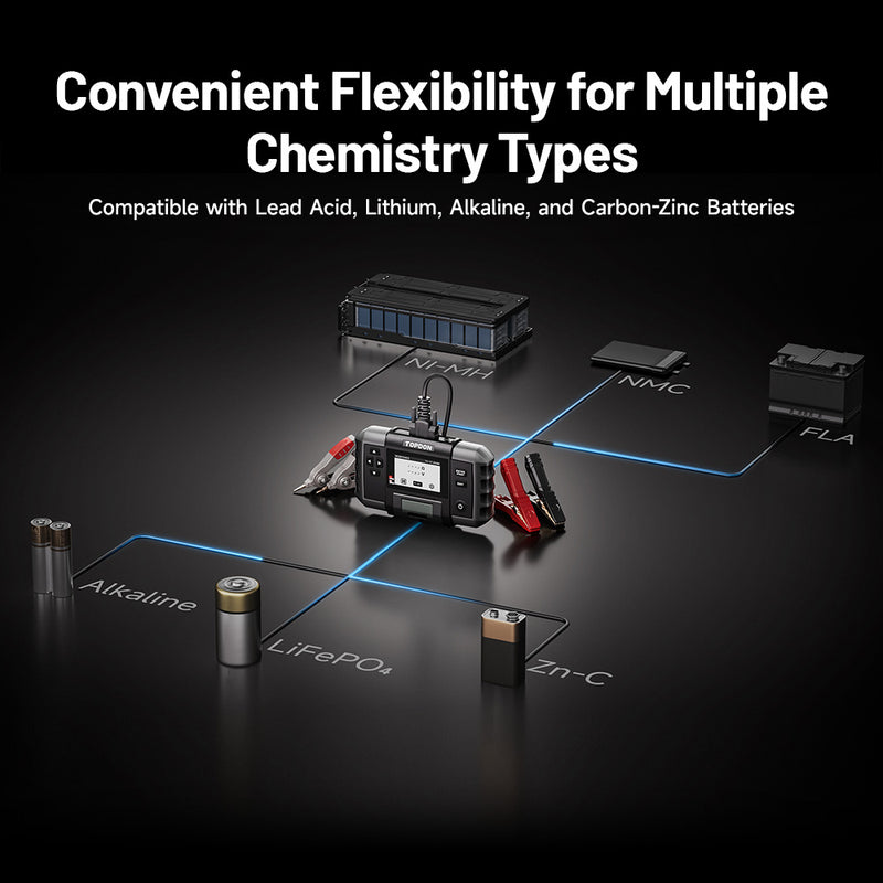 - Podporuje testování akumulátorů při 6V, 12V a 24V; startovací, nabíjecí a systémové testy při 12V a 24V. Je kompatibilní s běžnými (zaplavovanými), AGM, GEL a EFB akumulátory.
