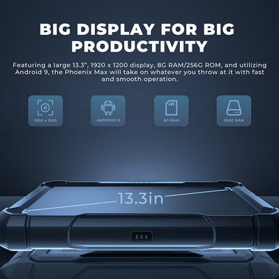 - Featuring a large 13.3”, 1920 x 1200 display, 8G RAM/256G ROM, and utilizing Android 9, the Phoenix Max will take on whatever you throw at it with fast and smooth operation.