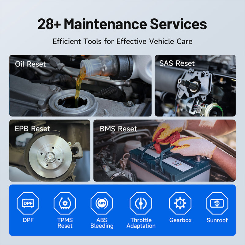 - With over 28 essential maintenance functions, from service light resets to battery registrations, this tool ensures vehicles are kept in peak condition, enhancing both performance and longevity. It provides the confidence that comes with knowing your vehicle is well-maintained, offering peace of mind on every journey.