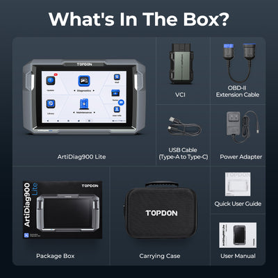 - Descubre el poder del ArtiDiag900 Lite de TOPDON, el lector de códigos OBD2 definitivo que lleva tus capacidades de diagnóstico a un nivel profesional. Con acceso de por vida a los 10 modos de prueba OBD2, ofrece información completa sobre una amplia gama de vehículos. Abre un mundo de posibilidades con funciones como lectura de DTC, borrado de DTC, análisis de datos en tiempo real, estado del monitor de preparación I/M, visualización de datos de imagen congelada, prueba de sensores O2, prueba de monitores a bordo, prueba de evaporación, recuperación de información del vehículo y función de búsqueda de DTC.