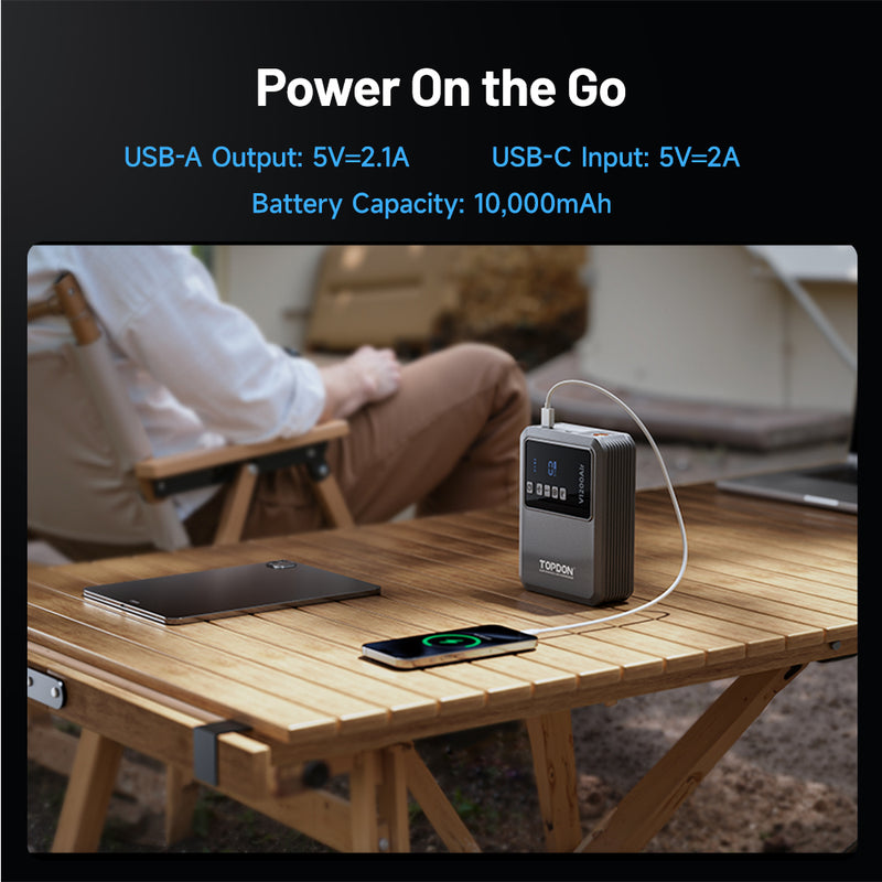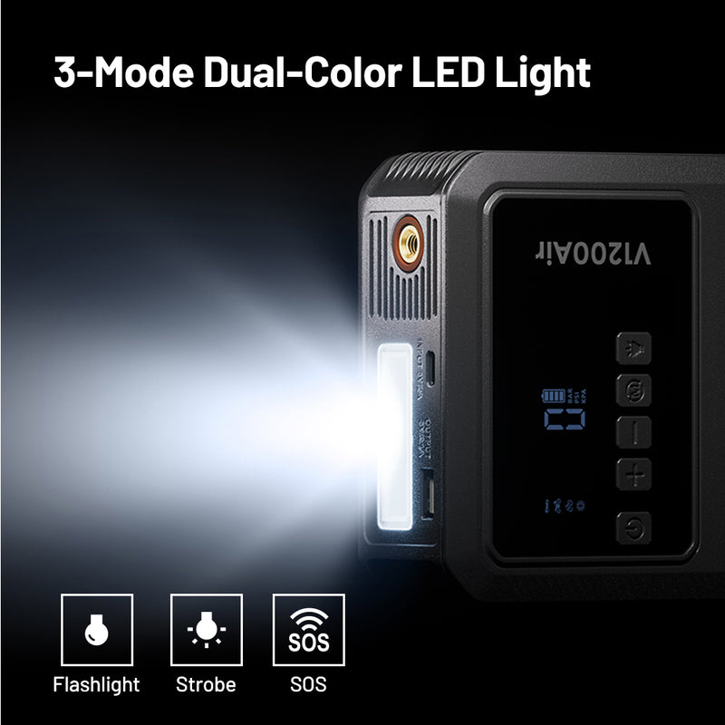 Tapaa kevyt (1,2 kg), työkalulaatikkoon sopiva tienvarsiavustajasi. Tämä kannettava tehopakkaus tarjoaa 1200A huippuvirran, joka pystyy käynnistämään 12V autot, moottoripyörät, veneet ja ajoneuvot, joissa on jopa 6,0 litran bensiinimoottori tai 4,5 litran dieselmoottori. Siinä on myös 5 älykästä täyttötilaa, joiden avulla renkaiden täyttäminen on nopeaa ja helppoa. V1200Air on varustettu 5-kerroksisella turvasuojauksella ja kirkkaalla 3-tilaisella LED-valolla, tarjoten monipuolista tehoa ja luotettavaa mielenrauhaa missä tahansa matkustatkin.