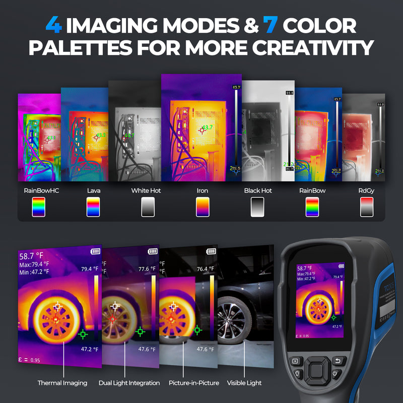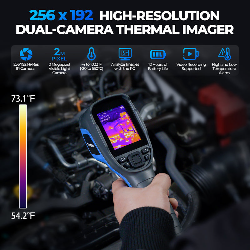 Il TC005 è una termocamera portatile che misura un ampio intervallo di temperature. Da -20°C a 550°C (-4°F a +1022°F), e offre un'autonomia di 12 ore. La fotocamera a infrarossi ad alta risoluzione 256*192 pixel ti permette di dire addio alle immagini sfocate. Lo strumento è pronto per l'analisi con le modalità standalone e PC, consentendo agli utenti di proiettare e caricare immagini dal TC al loro PC. I vantaggi aggiuntivi del TC005 includono sette opzioni per il Display a Colori Pseudo, una fotocamera a luce visibile da 2 megapixel per immagini sovrapposte e una modalità picture-in-picture.