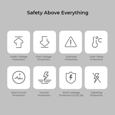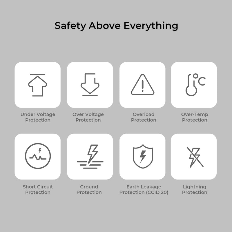 - Sikkerhetsfunksjoner inkluderer Under spenningsbeskyttelse, Over spenningsbeskyttelse, Overbelastningsbeskyttelse, Over-temperaturbeskyttelse, Kortslutningsbeskyttelse, Jordbeskyttelse, Jordfeilbeskyttelse (DC 6ma + Type A), og Lynbeskyttelse.
