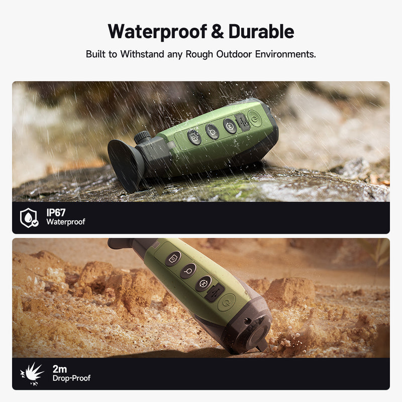 Nyt klare termiske bilder med høy IR-oppløsning på 256*192 og en jevn oppdateringsfrekvens på 50Hz, som gir delikate detaljer av omgivelsene dine. Bygget for å tåle tøffe terreng, sikrer IP67 vanntett vurdering holdbarhet i ethvert miljø, fra gjørmete stier til tette jungler. Med over 11 timers batterilevetid er det din trofaste følgesvenn for lange eventyr.