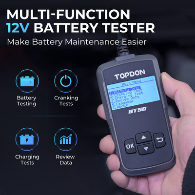 BT50 — это новейший тестер аккумуляторов от TOPDON, оснащенный самой передовой технологией тестирования проводимости для обеспечения более высокого уровня точности и производительности. Этот инструмент также включает защиту от обратной полярности для дополнительной безопасности, устраняя риск неправильных подключений.