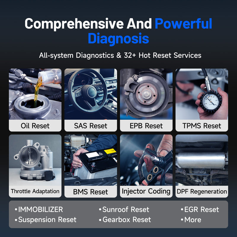 - Разблокируйте 32 общие услуги, такие как сброс масла, сброс EPB, сброс SAS, прокачка ABS и DPF для основных моделей автомобилей, чтобы повысить полезность Phoenix Nano в плановом обслуживании и продлить срок службы компонентов автомобиля для улучшения впечатлений от вождения.