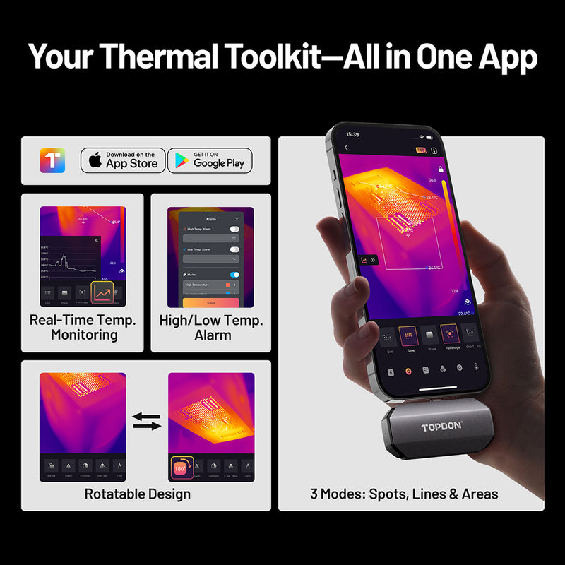 Получите чёткие тепловые данные, используя уже имеющийся у вас телефон или планшет. Универсальный TOPDON TC002C Duo легко подключается к любому устройству iPhone, iPad или Android с поддержкой USB-C, что позволяет с лёгкостью находить дорогостоящие утечки энергии или скрытые электрические/механические неисправности.