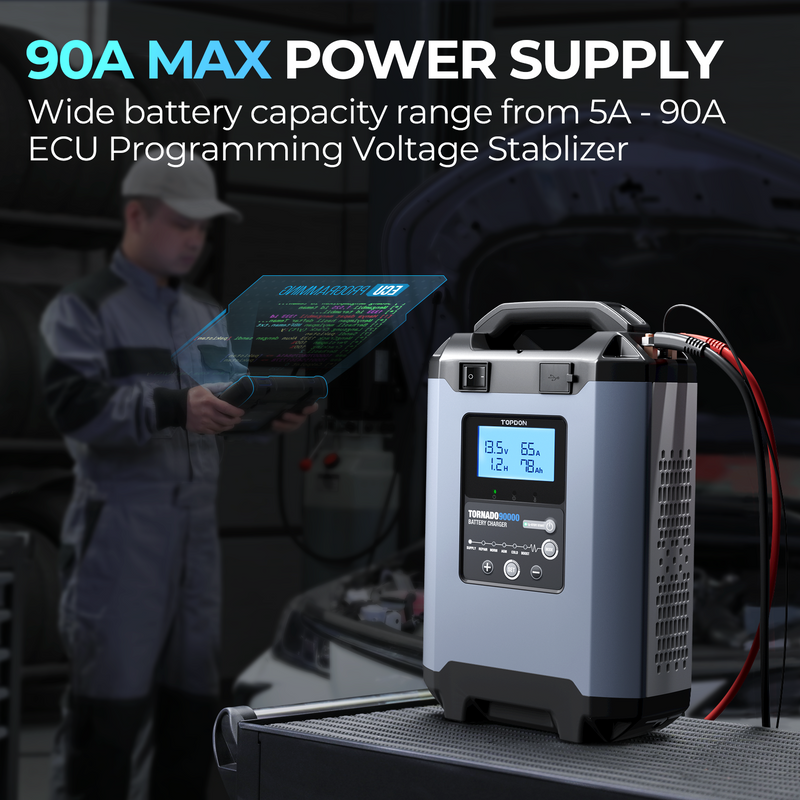 Tornado90000 - это новейшее передовое интеллектуальное зарядное устройство от TOPDON, предназначенное для профессиональных и коммерческих пользователей. Это устройство подходит для всех типов свинцово-кислотных аккумуляторов на 12В и 24В, с широким диапазоном емкости аккумуляторов от 5 до 90 ампер. Tornado90000 оснащен функцией редактирования тока/напряжения и обеспечивает пользователям необходимую защиту аккумуляторов благодаря 9-ступенчатому интеллектуальному методу зарядки и 6 режимам зарядки. Режим SUPPLY обеспечивает стабильный выход постоянного тока и может использоваться в качестве стабилизатора программного напряжения.