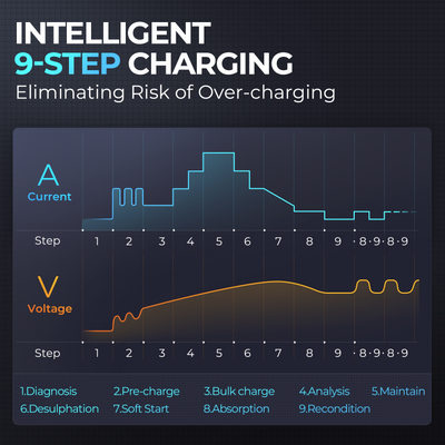 - Его "умная зарядка на 9 этапов" обеспечивает надежную защиту батареи, а система автоматической зарядки и отключения устраняет любой риск перезарядки.