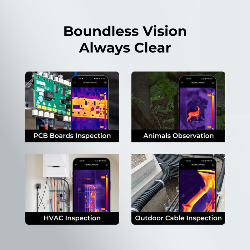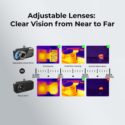 Испытайте непревзойденную четкость от ближнего до дальнего расстояния с TS001, длиннофокусным Android тепловизором, разработанным для захвата четких изображений, даже для объектов, таких как печатные платы.