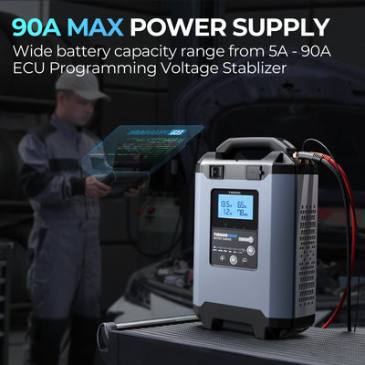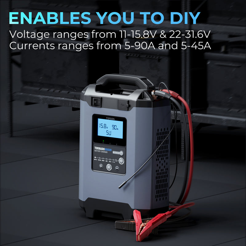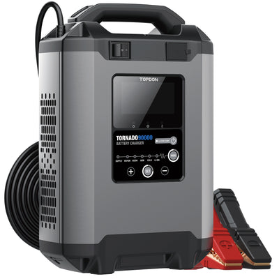 Tornado90000 je najnovšia špičková inteligentná nabíjačka od TOPDON, určená pre profesionálnych a komerčných používateľov. Toto zariadenie je vhodné pre všetky typy 12V a 24V olovených akumulátorov so širokým rozsahom kapacity batérií od 5 do 90 ampérov. Tornado90000 má funkciu úpravy prúdu/napätia a vďaka 9-krokovej inteligentnej metóde nabíjania a 6 režimom nabíjania poskytuje používateľom potrebnú ochranu batérií. Režim SUPPLY poskytuje stabilný jednosmerný výstup DC a možno ho použiť ako stabilizátor napätia pre programovanie.