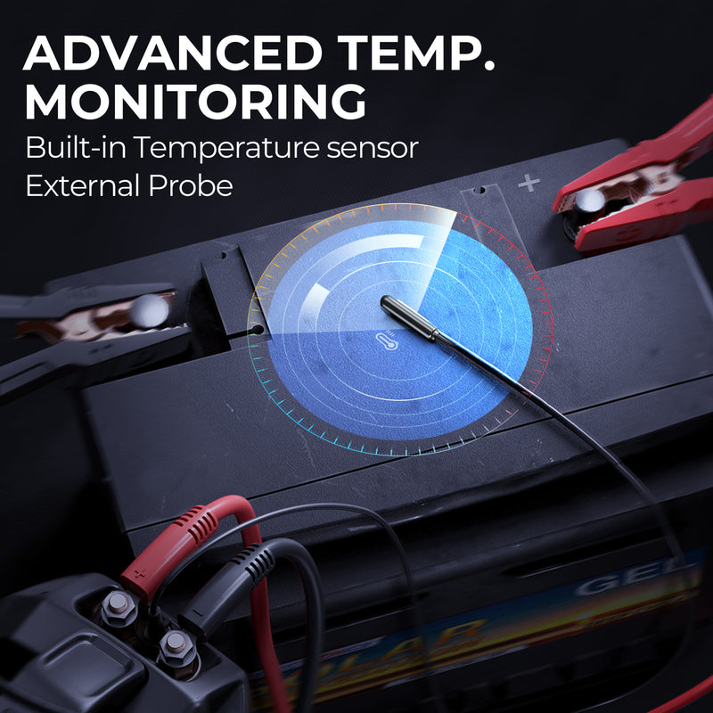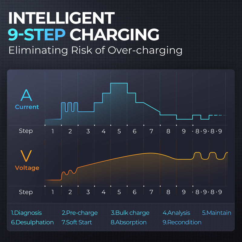 - Jeho „9-krokové inteligentné nabíjanie“ poskytuje batérii silnú ochranu a automatický systém nabíjania a odpojenia eliminuje akékoľvek riziko prebíjania.