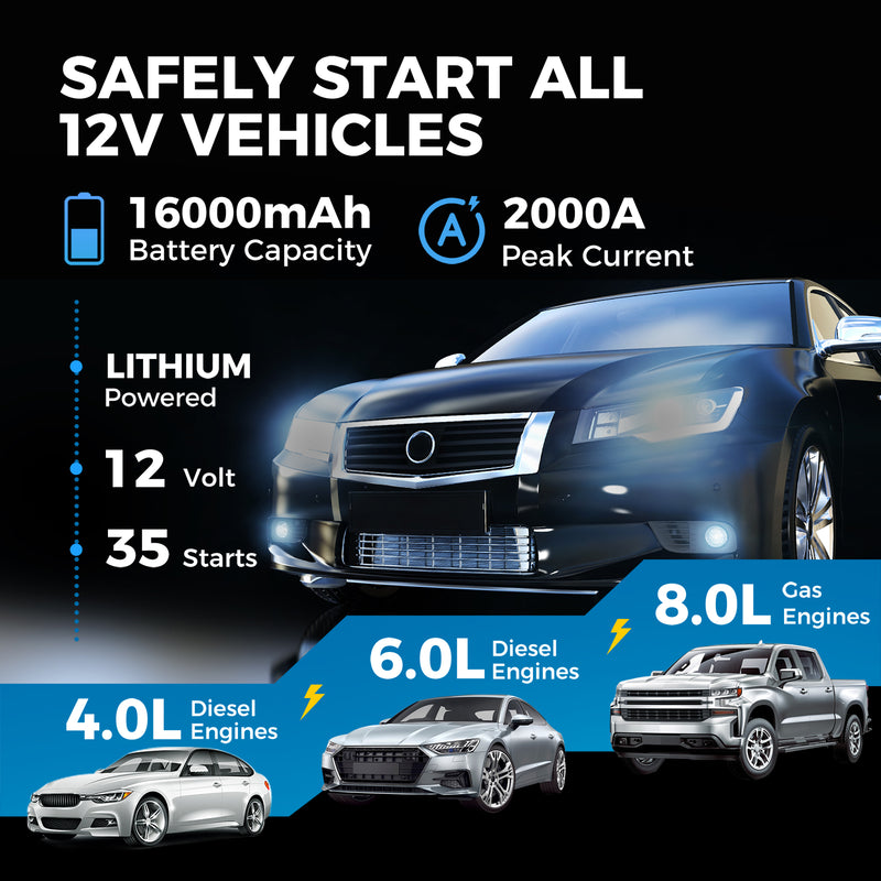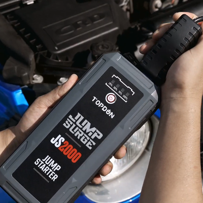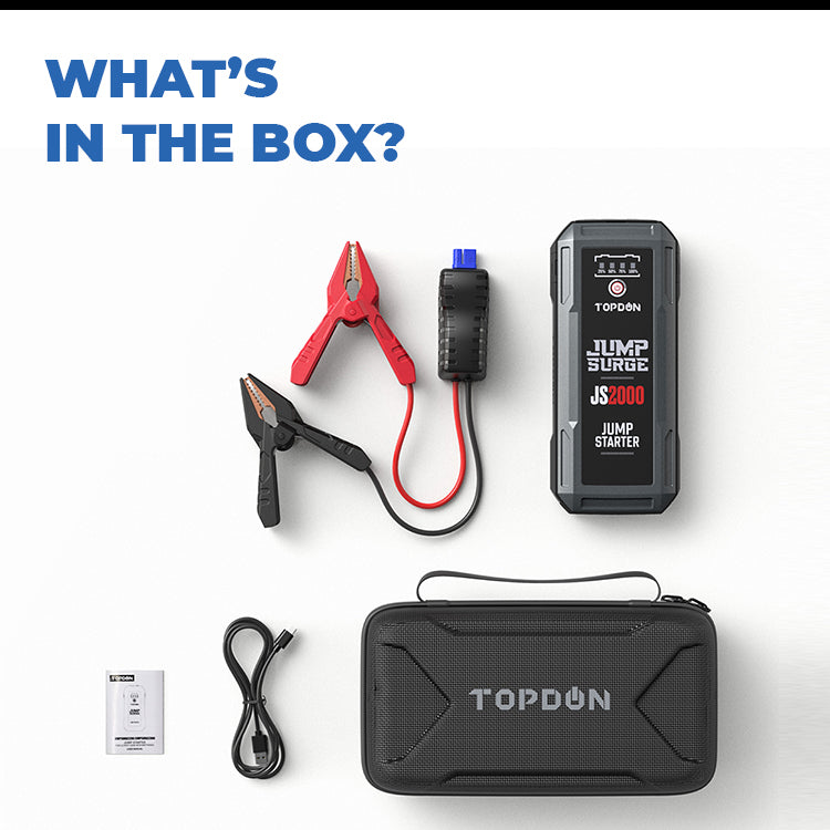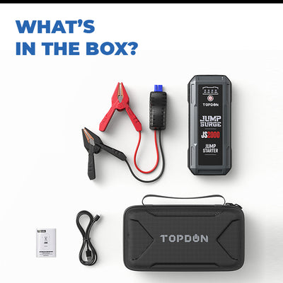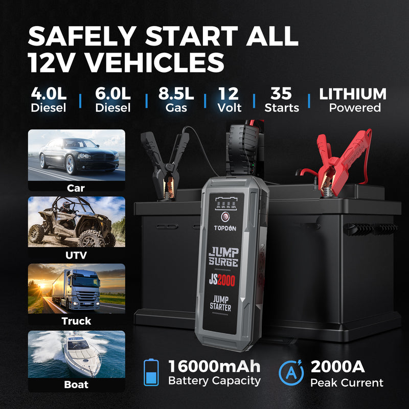 JumpSurge2000(JS2000) är en starthjälp och powerbank med 2000 Peak Amp för bilar, lastbilar, båtar, motorcyklar och mer. Denna enhet stöder fordon med 12V-batterier på bensinmotorer (upp till 8L) och på dieselmotorer (upp till 6L). Detta verktyg har flerskydd för extra säkerhet och laddar dina enheter snabbare än en standardladdare.