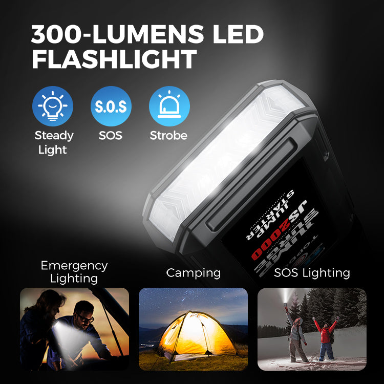 - JS2000 kan fungera som en powerbank: USB Snabbladdning 3.0-port, som stöder 5V/3A, 9V/2A och 12V/1A. Ladda de flesta enheter och elektronik helt inom en timme (smartphone, surfplatta, kamera, kindle, högtalare och mer)!